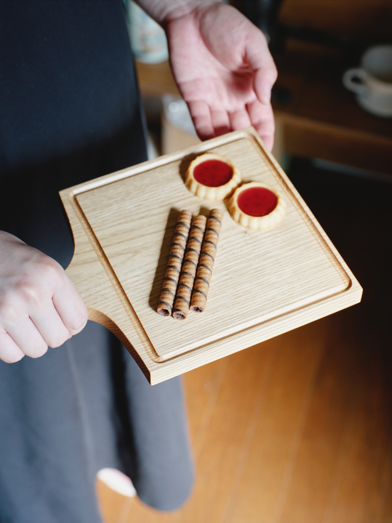 栗の木は水気に強いため、昔から、お風呂や台所などの部材に使われてきました。カット部分の厚みがしっかりあるので、食材を切る際もしっかり安定します。チーズやフルーツ、お酒のおつまみなど『ちょっとしたもの』をカットしてそのままテーブルに出せるサイズ。