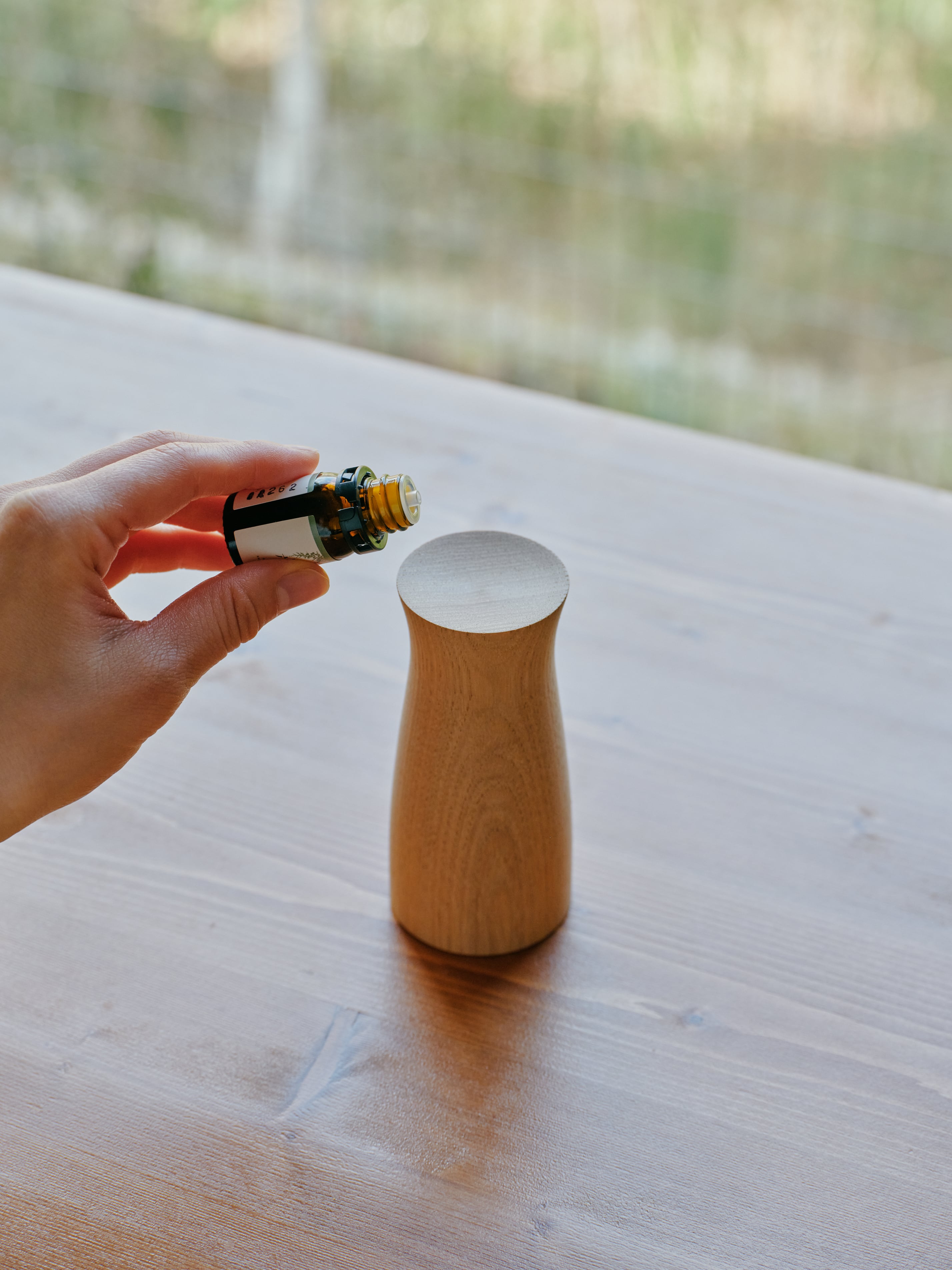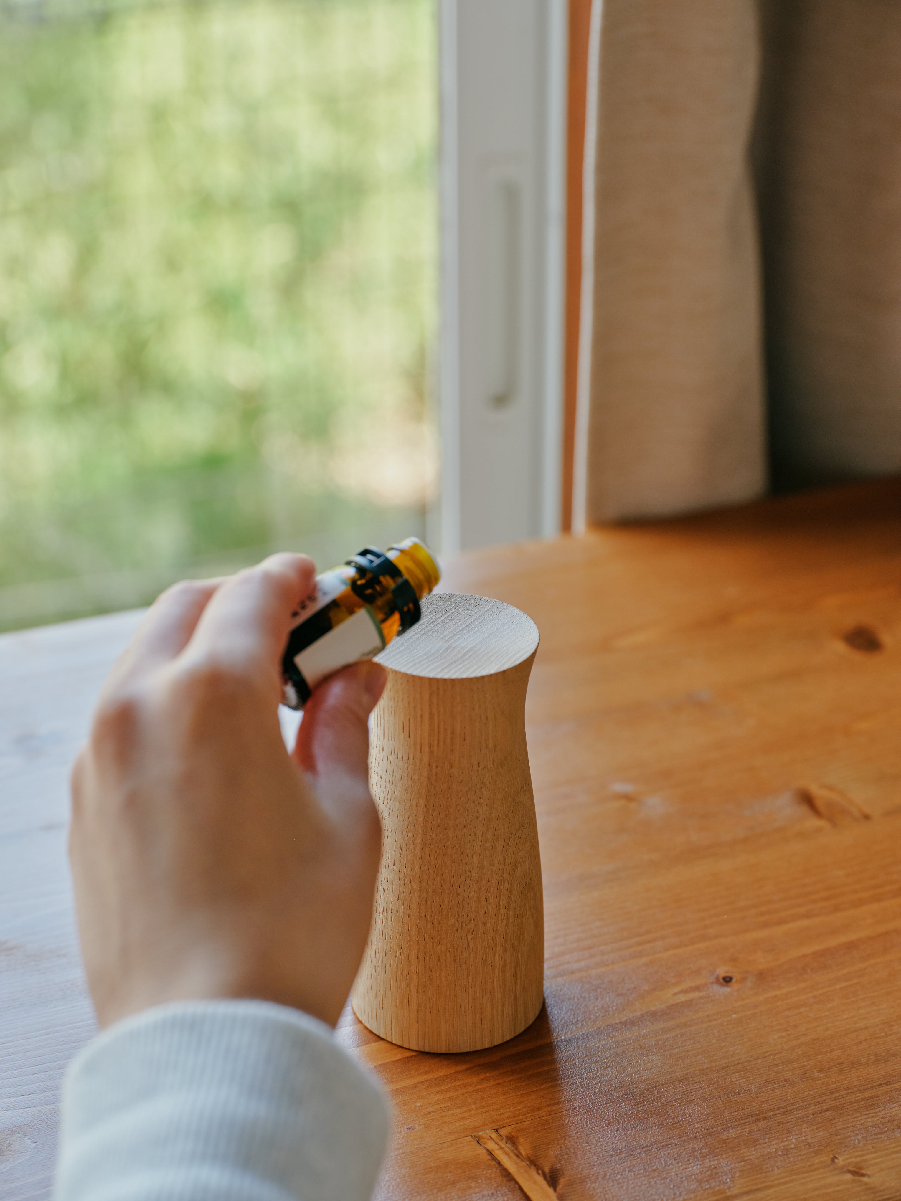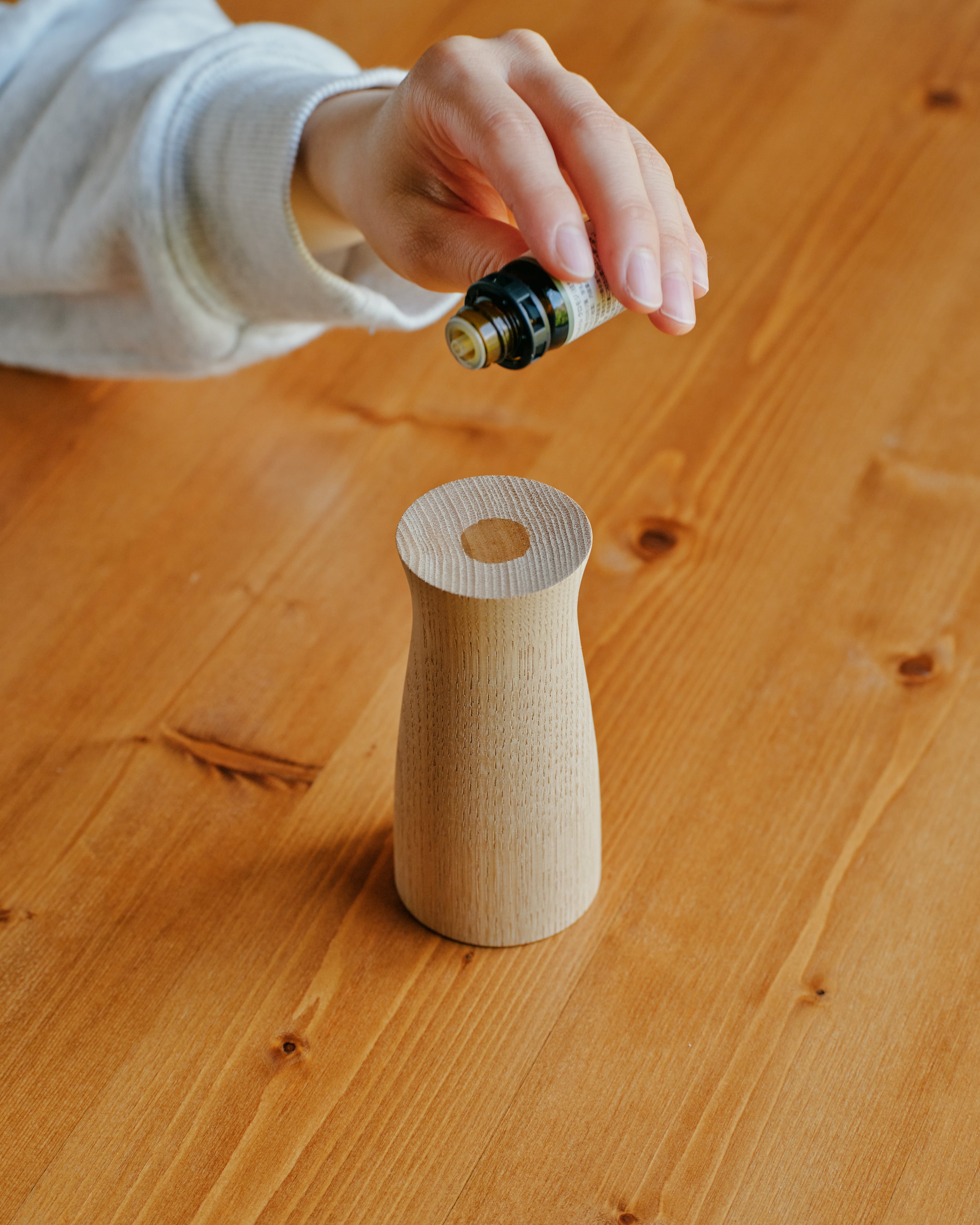 柾目挽きにより、目の細かい年輪が美しいうねりや模様を見せてくれました。トップ表面の窪みの部分にアロマエッセンシャルオイルを垂らしてお楽しみください。
