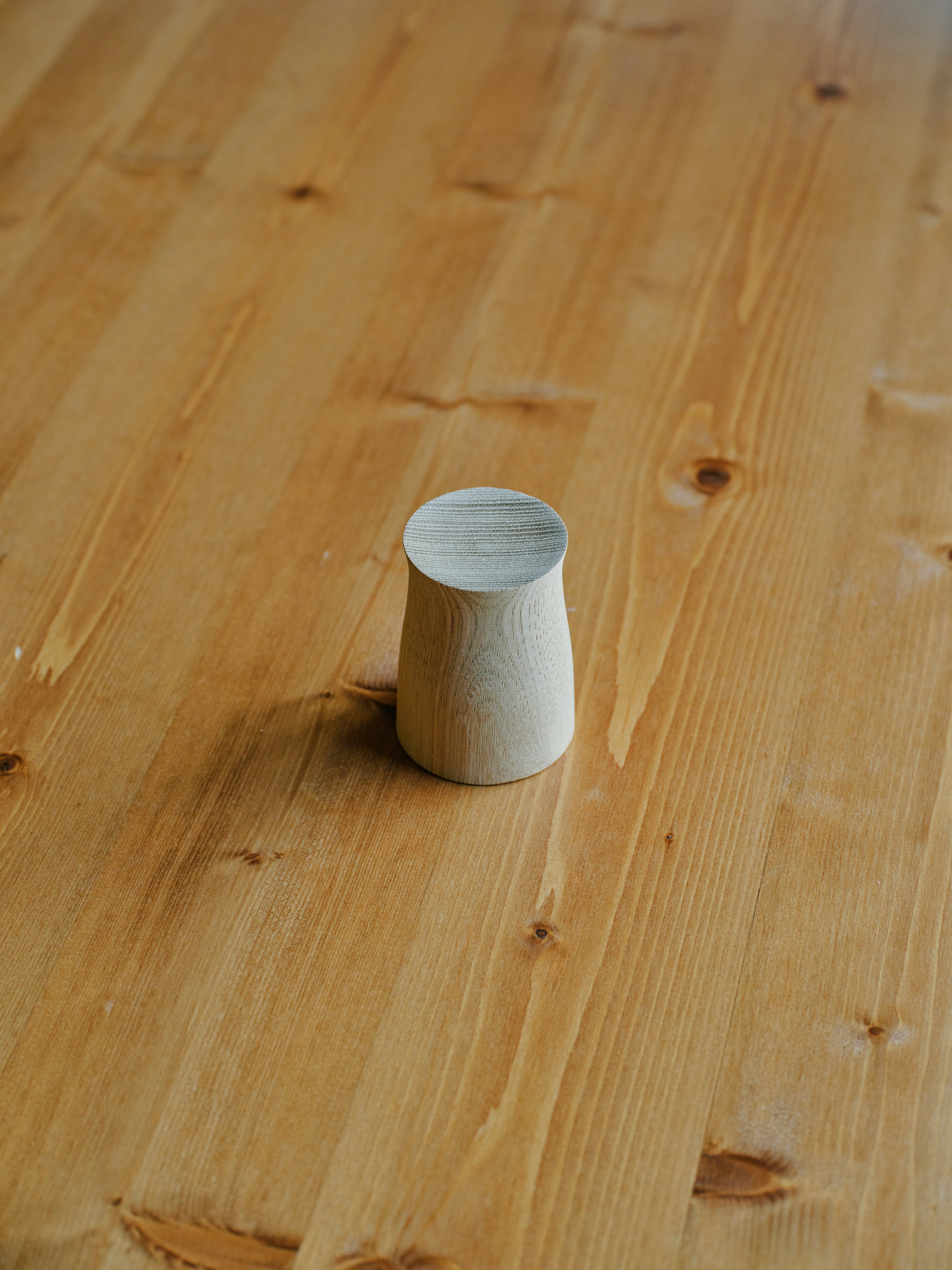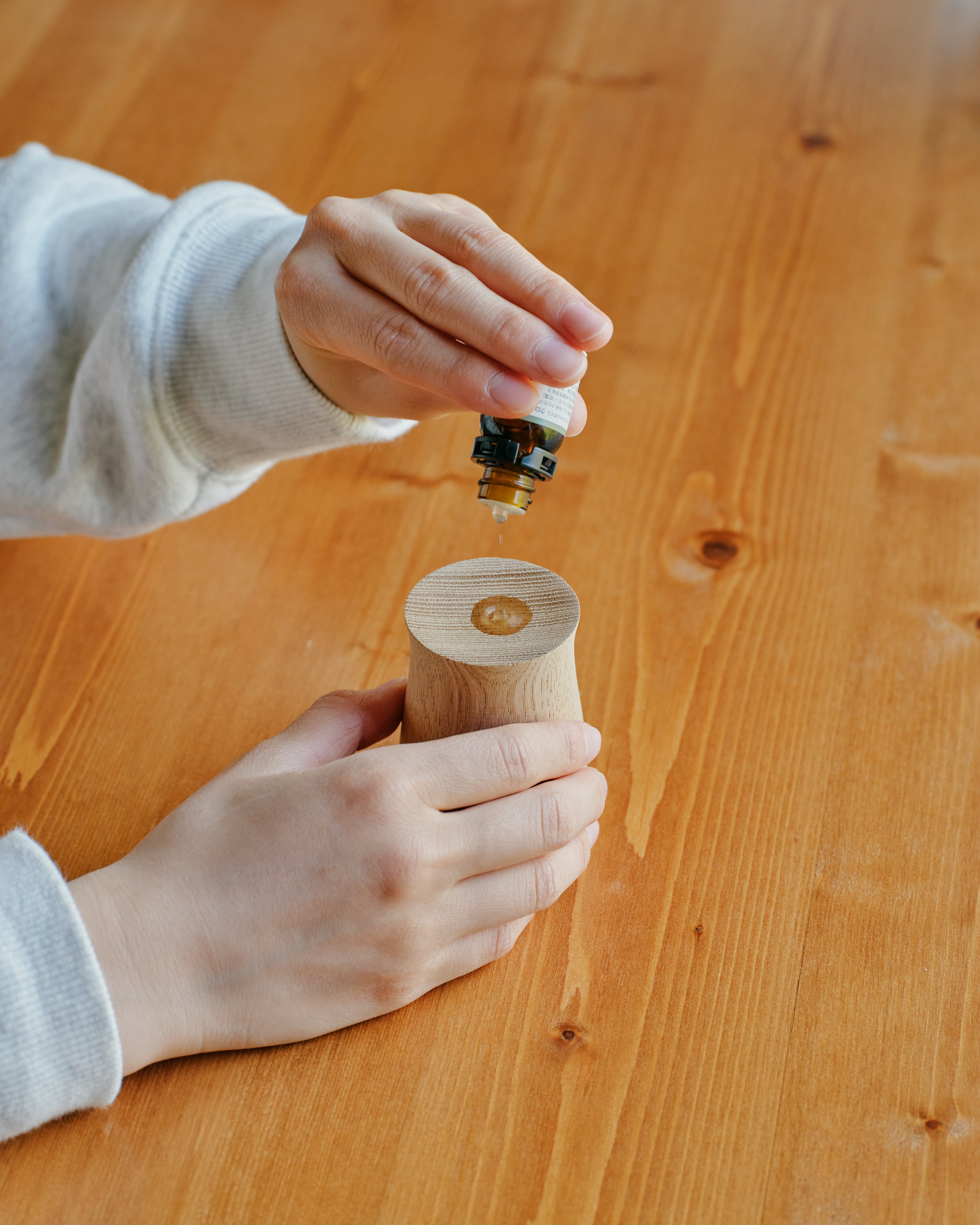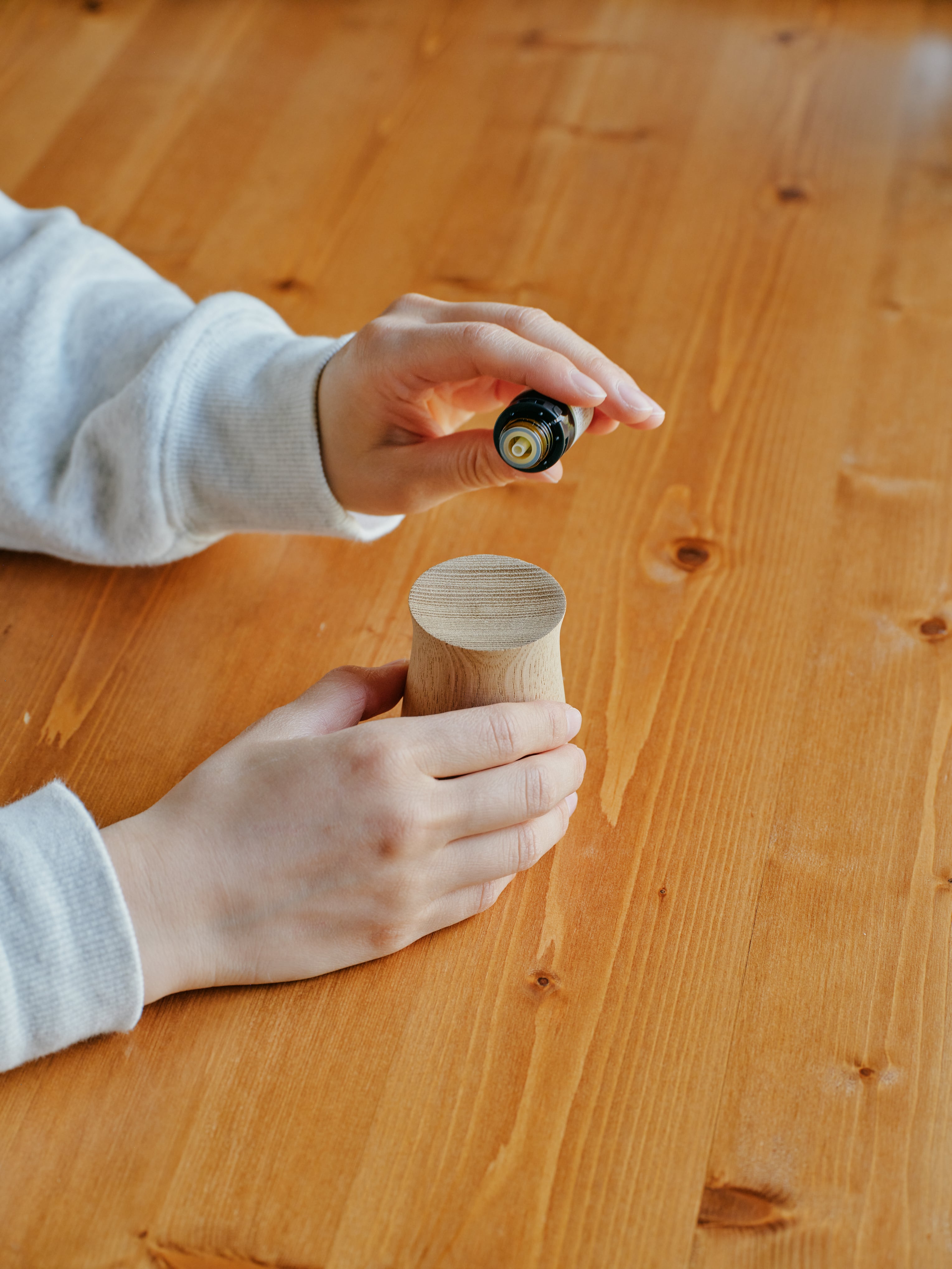 柾目挽きにより、目の細かい年輪が美しいうねりや模様を見せてくれました。トップ表面の窪みの部分にアロマエッセンシャルオイルを垂らしてお楽しみください。